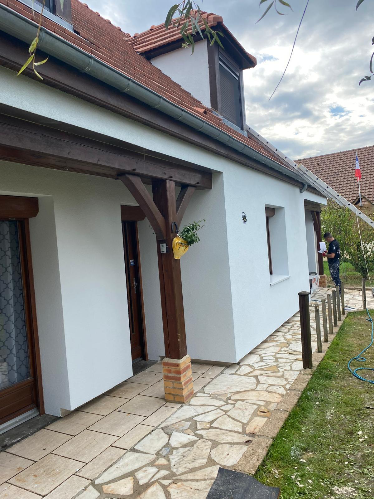 Cette maison individuelle a bénéficié d’une isolation thermique par extérieur performante grâce à des panneaux isolants en polystyrène expansé, recouverts d’un enduit blanc lisse pour une finition propre et moderne. En plus de réduire les pertes thermiques, cette solution permet d’embellir durablement la façade.